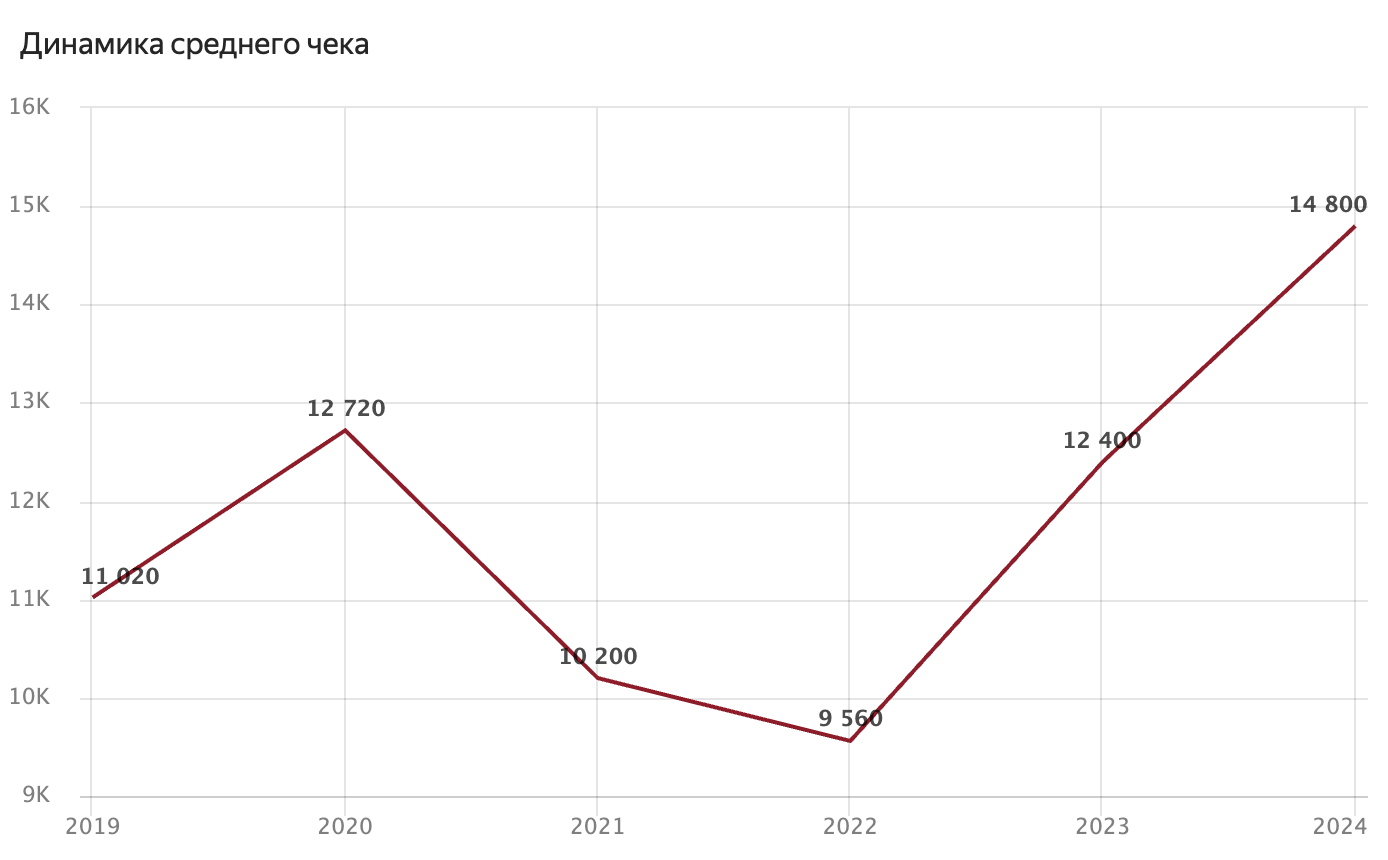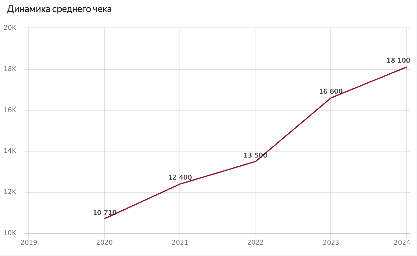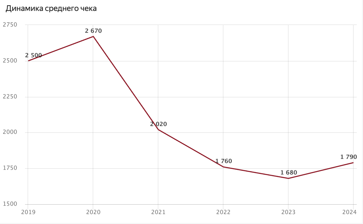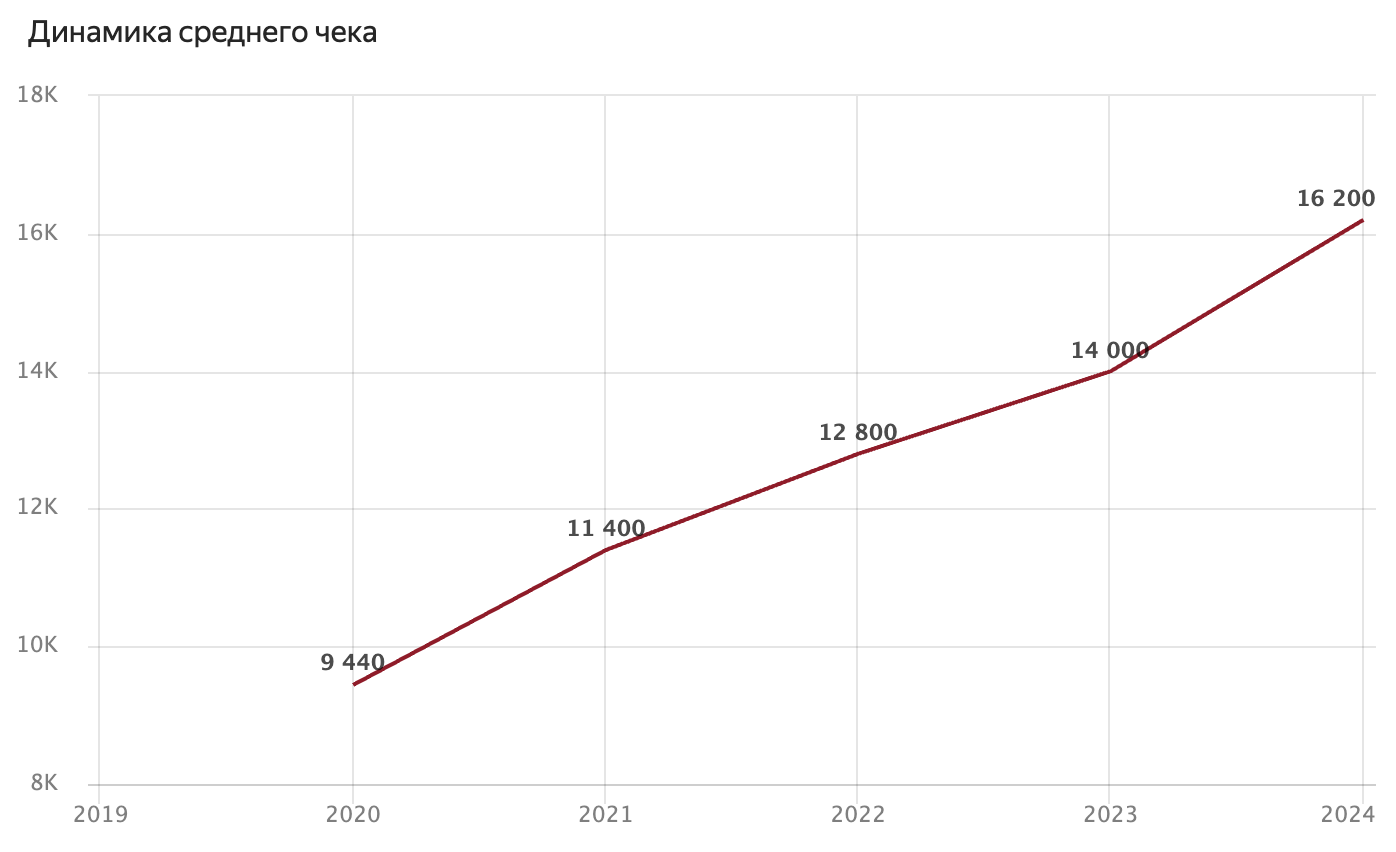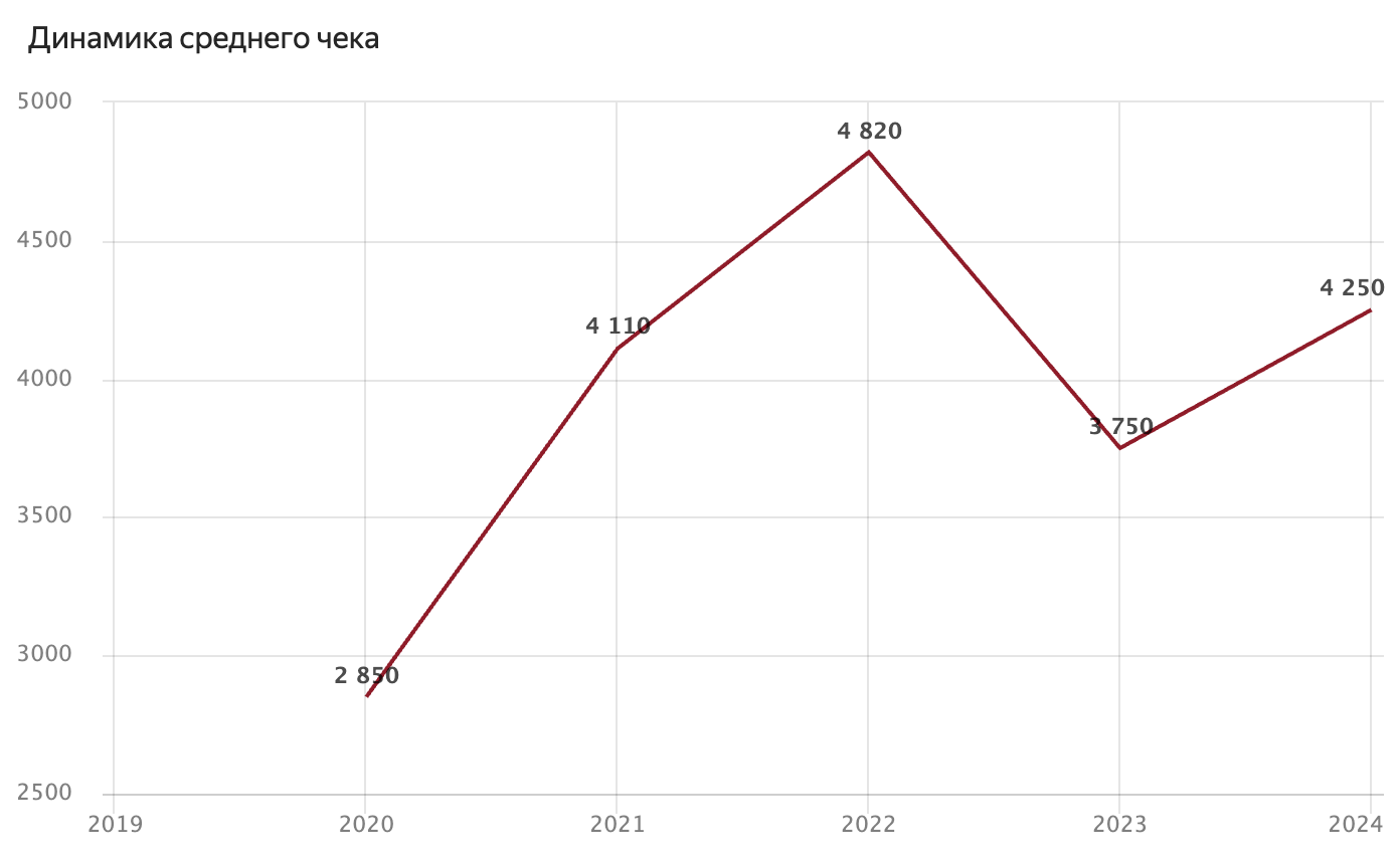 Рост тоже огромный, но средний чек стабильно высокий (сейчас около 1700-1800₽). Это платформа не для самых дешевых покупок.