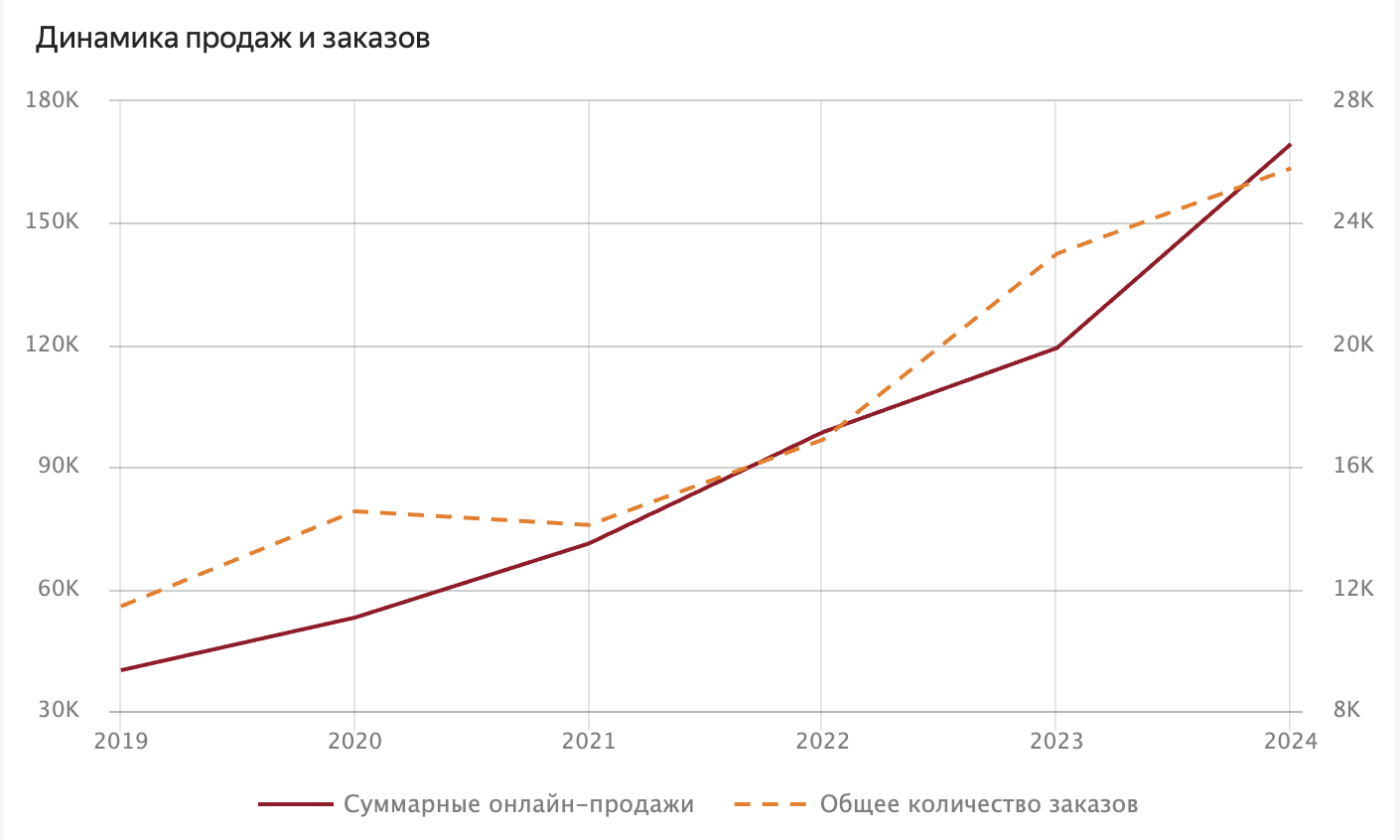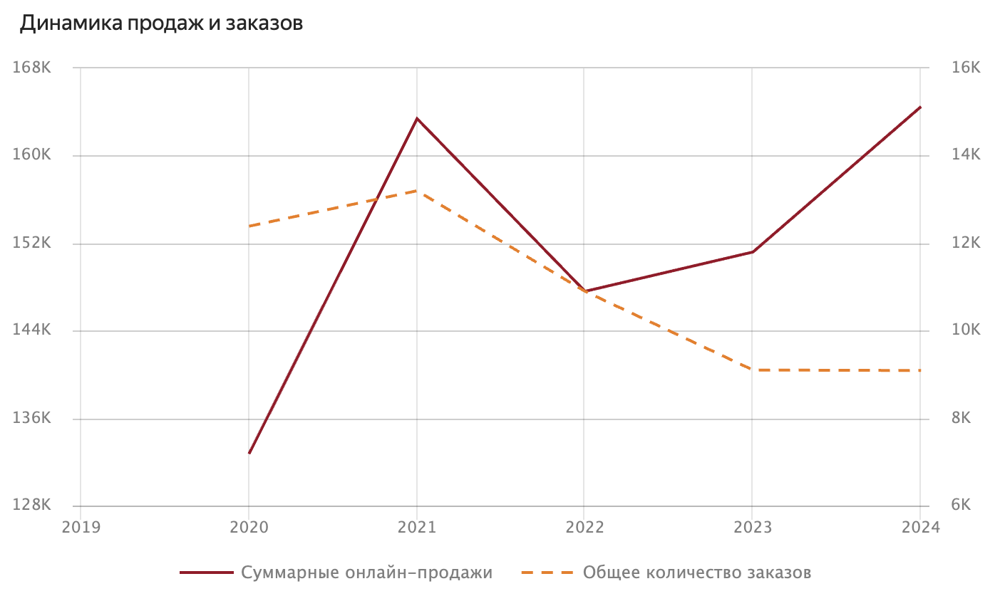 Я сгруппировала данные из открытых источников по 11 магазинам и 5 категориям. Анализ проводился по 3 ключевым показателям: онлайн-продажи (или выручка), количество заказов и средний чек.