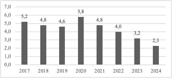 Уровень безработицы — основной показатель, характеризующий состояние рынка труда. Посмотрим его динамику за 8 лет (с 2017 по 2024 г.г.).